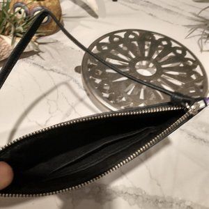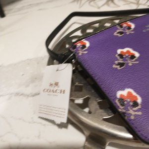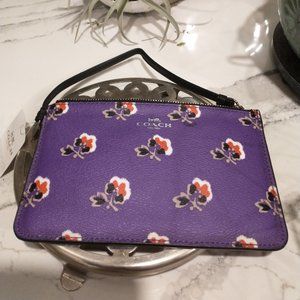 NWT - Coach small wristlet with a flower canvas in purple with silver zip closure, fabric lining Strap with clip to form a wrist strap or to attach to the inside of a bag size is 7"L x 4 1/4"H Can fit a iphone or android Bramble Rose Print Canvas
