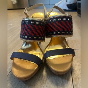 Gorgeous slingback heels with a stylish red navy weave, perfect for ankle pants and dresses in good condition. See pictures for condition