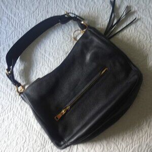 Spacious, softly structured hobo bag with textured pebble leather finish. Goldtone hardware, One outside back zip pocket, One inside zip pocket, One inside cell phone, pocket, Inside multifunction pockets, Lined, Polished pebble leather. SIZE - Top handle, 7.75" drop Removable, adjustable strap, 22" drop,12.5"W x 10.5"H x 3.5"D