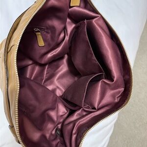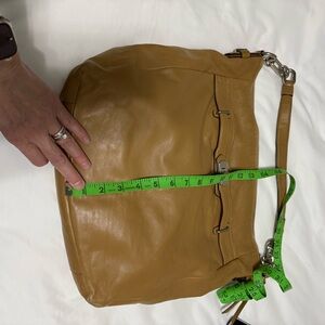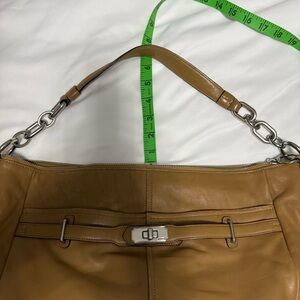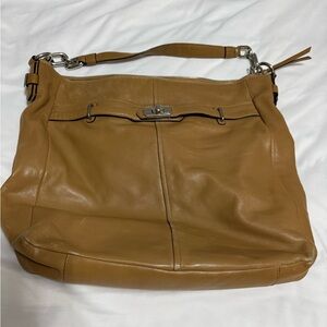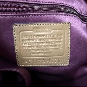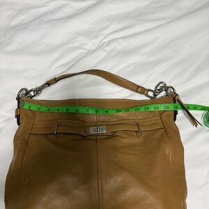 Coach leather shoulder bag with full zipper, chrome hardware, a rich burgundy satin lining with one large zippered pocket and two cell phone pockets. Non smoking, no smells or rips. There is some wear on the bottom corners and front of the bag but has lots of life left.