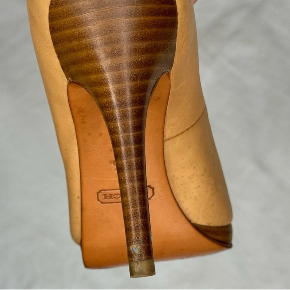 Coach Tan Leather Round Closed Toe wood High Heel Pump Shoe Sz 6 neutral colour