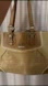 Elegant Coach tote in tan and cream leather. Features sturdy straps and iconic logo. Ideal for everyday use.