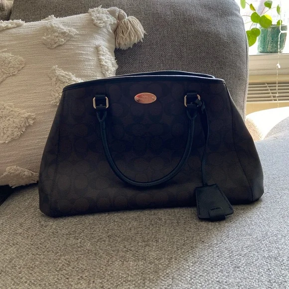 Preloved Coach tote with a settle coach logo pattern. Comes with a removable adjustable crossbody strap. Clasp closure and a zipper compartment in the middle. One large pocket and 2 smaller pockets on the inside. About 13” L x 6” W x 8.5” H. Excellent condition
