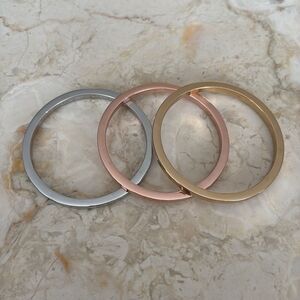 Lovely set of three Coach bangles in white, yellow and rose gold tone. Simple and elegant, these bangles are a classy addition to your jewelry collection.