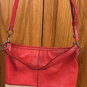 Stylish Coach crossbody in vibrant red and cream. Ideal for daily wear.