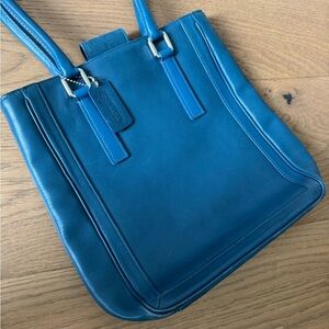 Authentic Coach Legacy tote in a rare vibrant teal blue full-grain leather. Style No. C1P-9422, handcrafted in Costa Rica with the signature creed patch and Coach hangtag.