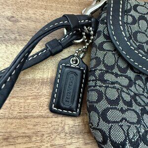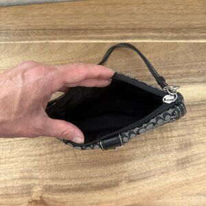 This is a great not-too-small wristlet that will hold a fair bit! It holds quite a bit more than the ones with the squared-off corners, as the main compartment is about an inch wide, plus the outer slip pocket.Two compartments- main zippered, and one slip pocket under the magnetized flap. Excellent condition.