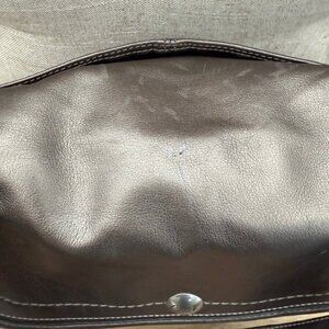 Great bag that's just the right size to carry what you need without being too much, but will easily fit a large wallet and water bottle. Front flap opens to a two compartment inside. The front section has a zippered pocket and two slip pockets, and the other compartment has none. The is also a large open slip pocket on the outside back. It has some damage to the finish on the flap on the top of the purse, but it's not really noticeable when worn. Gorgeous metallic bronze leather with silver hardware.