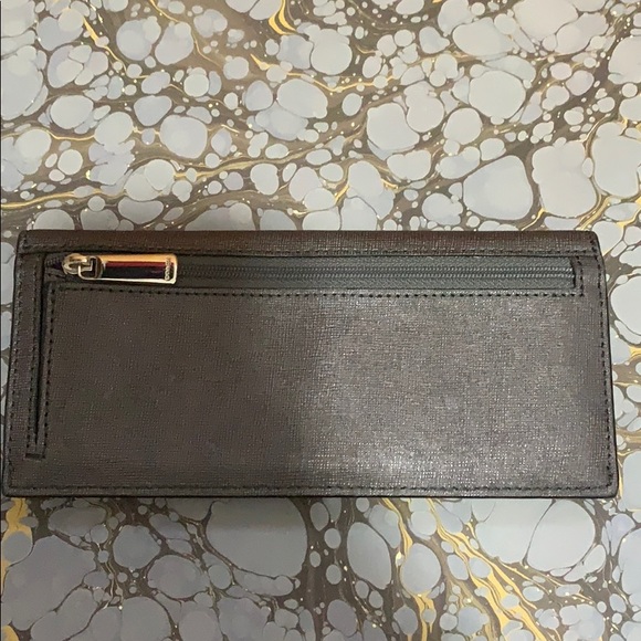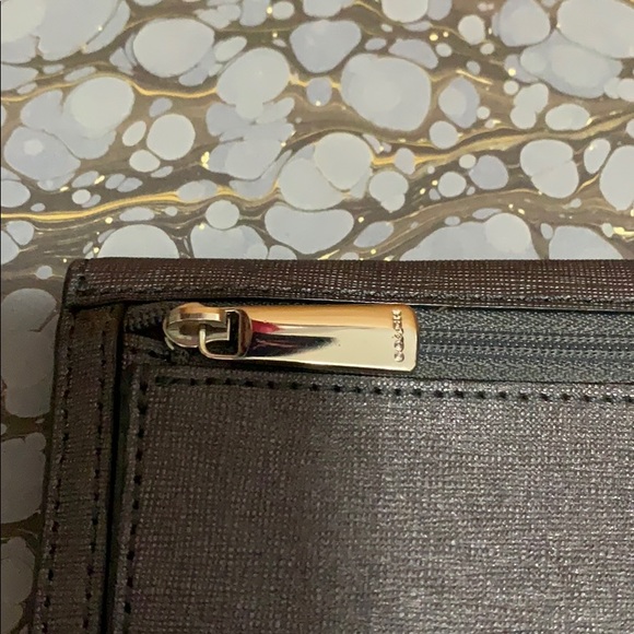 A gorgeous grey gunmetal Saffiano leather with beautiful purple lining. The lining is a smooth leather under the flap. It looks like in brand new condition except the slight imprint under the flap. The zipper pull is very shiny and looks brand new. Has 8 card slots. It is very slim but quite roomy.