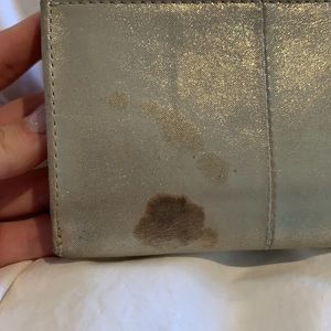Beige shimmery/metallic authentic gold wallet. Used, stains and damage shown in photos. OBO