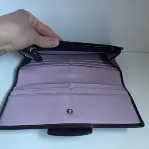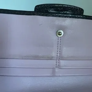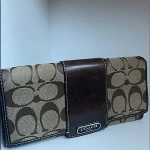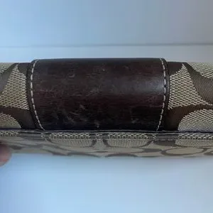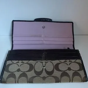 Coach wallet - brown and tan. Lavender interior. Lots of space to carry cards. Minor scratches on front side of leather (see photos). Minor discolouration on inside (see photos).