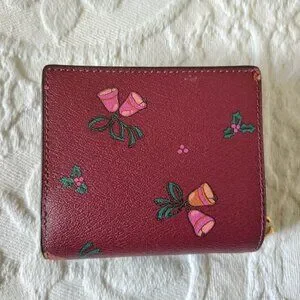 EUC Coach snap wallet in the Holiday Bells print measures approx. 3.5"x3.25"x1" and is in printed coated canvas with smooth leather. The wallet has a zip coin section, 1 clear ID window, 3 credit card slots , 2 slip pockets and a full length bill compartment..