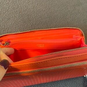 Beautiful coral pink colour. Good over all used condition but main zipper needs replacing. Still functions as is. Other zippers work well. Can be used as a clutch.