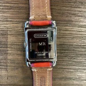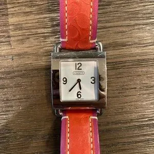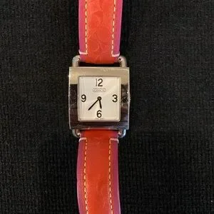 Ladies Coach watch with pink and red leather wristband; classic one of a kind piece; Requires new watch battery; minor wear on face please see photos.