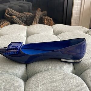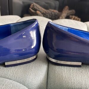 Gorgeous Coach Wesley blue patent leather flats with pointed toe, patterned bow detail, silver textured heel trim with coach logo, leather outsole. Size 37. Excellent used condition with some wear to leather outsole. Please see photos, measurements are for reference only. Reasonable offers welcome!