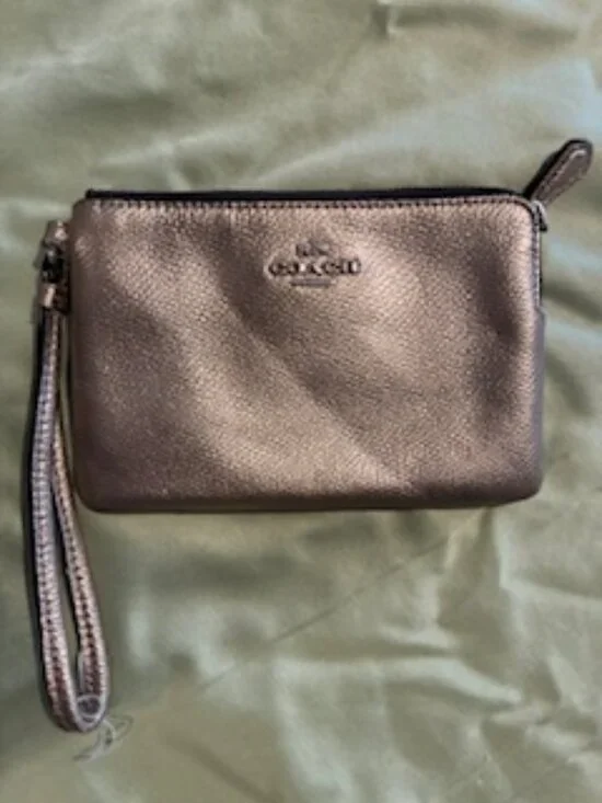 Elegant gold Coach Wristlet, could be taken to a wedding or just a fun night out.