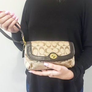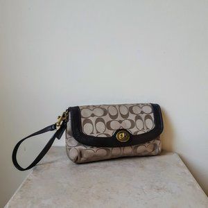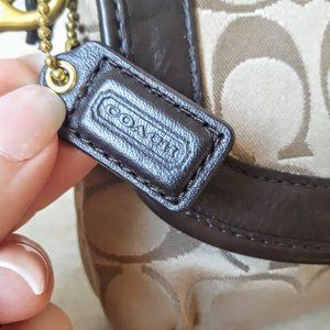 This cute Coach signature purse has a brown leather trim and solid brass hardware. Wear it as a wristlet or baby purse. Rommy and clean inside, hardly used. No wear or damage. Very nice.
