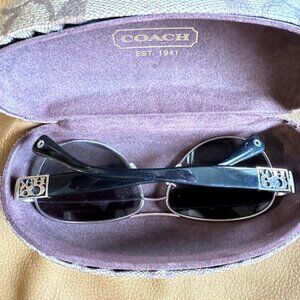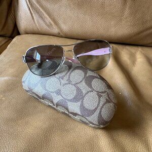coach aviator sunglasses with case. silver coloured rims. Earpieces are black on the outside/pink inside. Quality lenses.