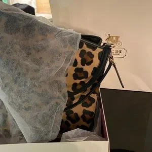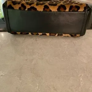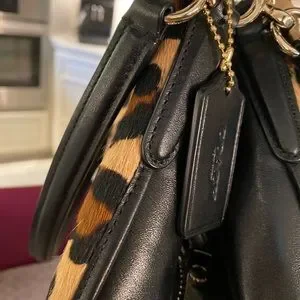 This Coach signature real leather leopard skin bag is the most luxurious. It is a beautiful must have functional bag (triple compartments). The craftsmanship is incredible and the leather is beautiful and soft with magnetic clasp. Approx 12W x 11H x 5.5D”