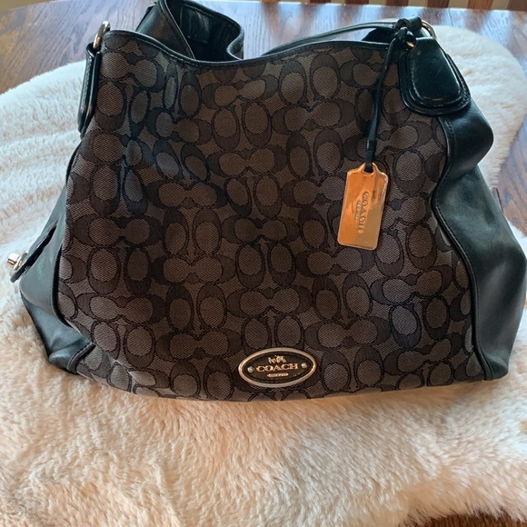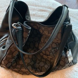 Coach shoulder bag. Middle zipper compartment. Two side compartments. Please see pics for measurements. Side zipper and phone compartments. In very EUC and shape! Have a small