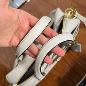 gently used white coach bag it has some spots, but it’s very minor comes with a shoulder strap. It has two extra compartment in the front and in the back and also the usual compartment in the middle.