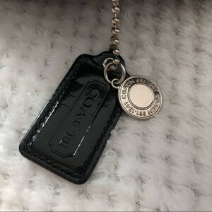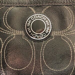 Mint condition, black patent leather coach purse, coach logo printed bag, zip top, two handles and side pocket plus zipper pocket inside bag as well as phone pockets.