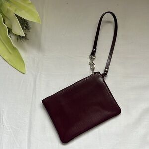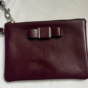 Coach wristlet made from glossy patent leather with a Saffiano or cross-hatch texture and front bow detail.
