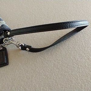 Authentic Coach clutch purse classic design - black and grey with light blue inside liner material. Strap is detachable on one side so it can be used as wrist strap or as a purse handle.