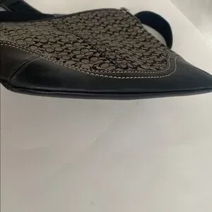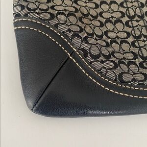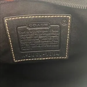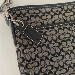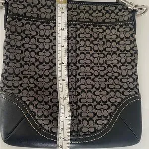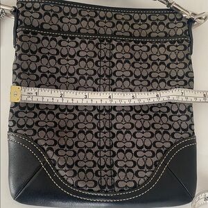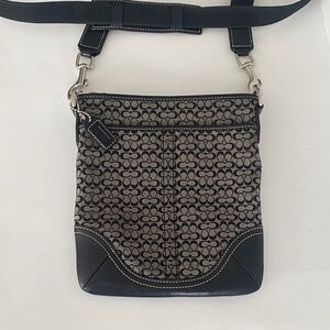 Coach signature canvas, Crossbody with black leather trim, featuring the classic C logo pattern, zip, top closure, adjustable fabric strap, and silver toe hardware. Made from canvas and leather trim, flat profile designed for hands-free convenience and carrying the basic essentials. Black and tan in color. Exterior features open pocket. In next to new condition.