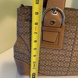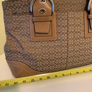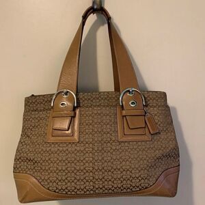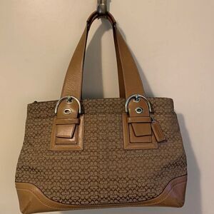 Coach zippered handbag or tote in classic Coach fabric with real (of course) leather trim. Shiny silver coloured horse bridle hardware. Has Coach leather patch with registration number, Coach leather tab, Coach stamp on hardware, Coach stamped snap closure, all requisites of authentic Coach quality. Excellent used condition with a few barely noticeable wear marks on bottom, as shown. Fully zippered, 1 exterior pouch. Interior is as new with no stains or rips detected, fabric lined with 1 zippered compartment, 3 open pockets, attached key fob. The perfect way to upscale your classic jean ensemble for day or weekend wear. Add the coordinating walking shoe (shown, listed and priced separately in Our Closet) and become the Diva on a Dime to turn all your friends "pea green with envy". Fresh and Fabulous for you from Lemon Squeezy Shop🍋