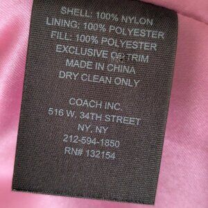 A classic, easy to layer, transitional jacket with the subtle coach monogram all over. Gold toned logo buttons, beautiful pink interior with slight sheen. Classic collar, side hand pockets. Snap button front closure. Nylon, polyester, polyester fill. Side snaps at bottom hem, allowing for easier movement. Light subtle gold thread stitch. Make it your everyday chore jacket. Quiet luxury!