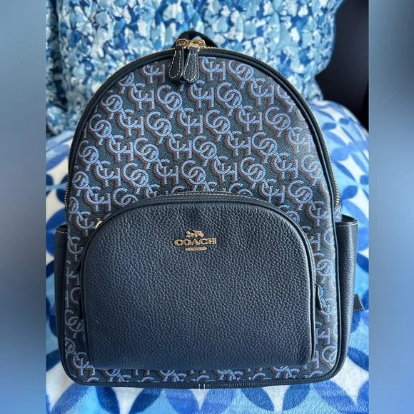 Coach monogram backpack original. Never used like new. 2 compartment with gold zipper & also small side zipper inside, small pockets & small functional outside zipper. Adjustable back strap.