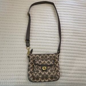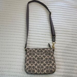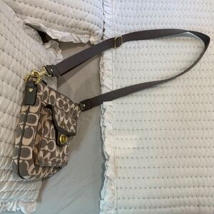 Coach over the shoulder bag . 8.5 x 7 inches light grey, with Coach monogram. Good condition Almost not worn. Material canvas.
