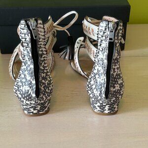 Leather lace up flat sandals. Back has zipper closure. Ivory/shake-skin pattern. Gently worn with small chip on the leather on the front toe part of the left shoe