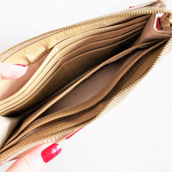 Coach wallet / wristlet signature khaki beige tan canvas & cherry red leather