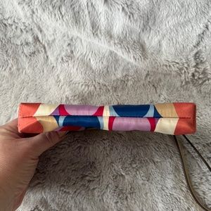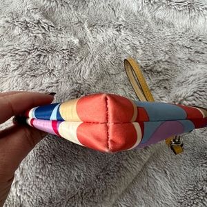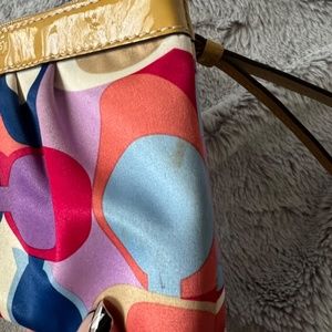 Satin coach wristlet, mustard color patent leather and satin coach “C” logo. Some minor wear on bottom corners, and a couple minor stains in fabric that could be removed with a stain remover.