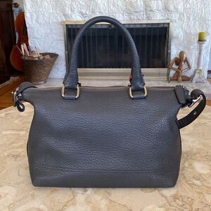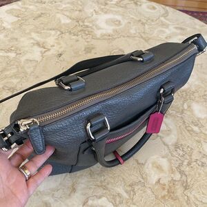 The Coach Legacy satchel has duel rolled handles plus an adjustable shoulder strap. Made of rich pebbles grey leather with contrasting pink details, this roomy bag has an exterior slip pocket plus and exterior zippered pocket.