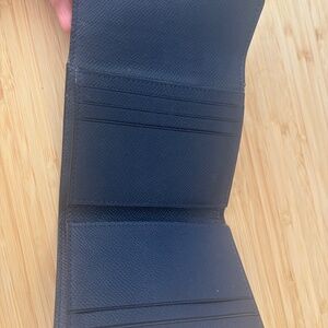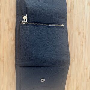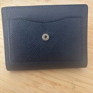 Navy blue leather bifold wallet. Compact design, multiple card slots. Good for everyday use.