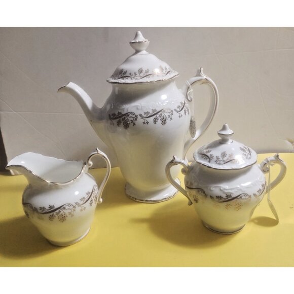 Coalport Bone China Tea Pot, Sugar & creamer set "Burgundy" pattern