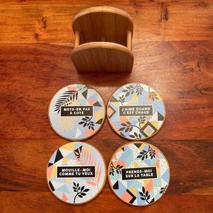 Coasters in French, Set of 4 Montreal-made wooden coasters with holder
