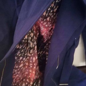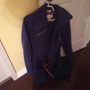 Wool exterior, zipper front, belted. modern. Royal blue.