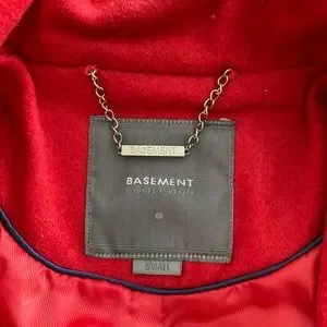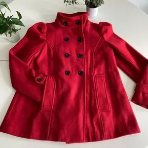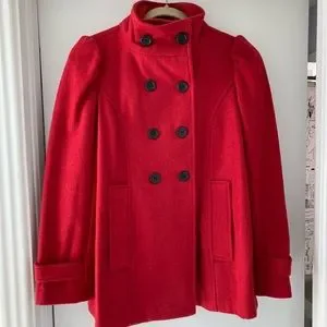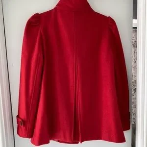 High collar and long sleeves with gathered shoulders. Flap pockets at front. Interior lining.