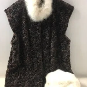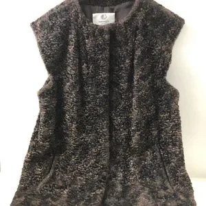 Vintage Overcoat with rounded collars or could be a sleeveless jacket. Color: brown. Material: 63% acrylique and 37% cotton. Has a soft wool feel to it. A sheep knit look. Ties with hook buttons on the front. élégant to chic. Slip in discreet hand pockets on the side. Full length: 29.5 inches. Underarm to underarm seam: 21.5 inches. Item for sale does not include accessory on photo which is only posted as an example of how to wear the item