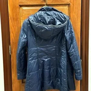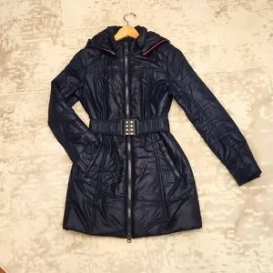 Windproof, lightweight, water repellent dark navy fall/winter coat with a belt. Size SMALL. Very comfy.