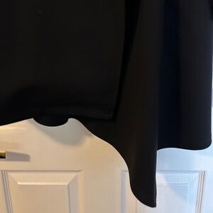 Black Flared Hem asymetical coat. Beautiful hook closure detailing with two buttons inside the neck,, 39"to the longest hem point , 24" sleeve,
