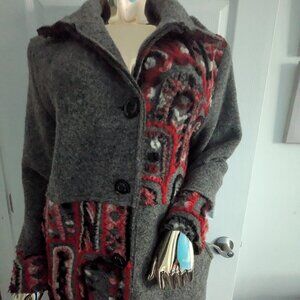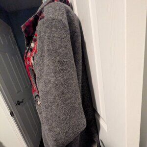 Italy. 80% wool and 20% polyester. Size: x-large. Pit: 55 cm. Sleeve length: 55.5 cm. Total length: 90 cm. 5 large buttons. 1 pocket on each side. Fine black lining 100% polyester. Dark gray with patterns: red, white, black. Lightweight.