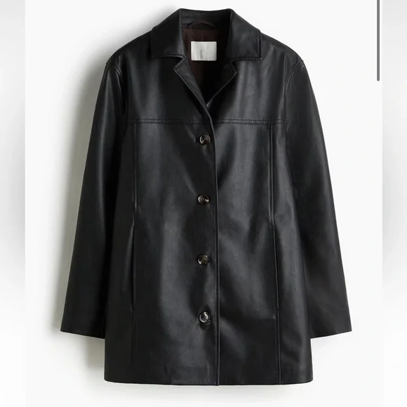 Jacket in coated fabric. Collar, lapels, buttons at front, and discreet side pockets. Vent at back. Lined