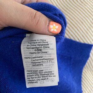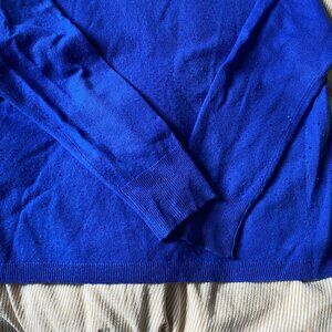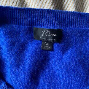 Beautiful cobalt blue sweater from J. Crew. 100% cashmere. Size XL. Excellent used condition. Minor pilling that could be cleaned up with cashmere shaver. One small stain as shown in photo with my finger. Not very noticeable. Gorgeous and good quality. Sad to part with is -- just not my current size.