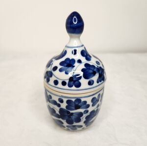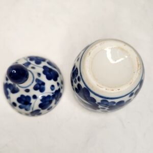 Miniature white porcelain Chinese lidded paste ginger pot with a handpainted Cobalt blue Crysanthemum bloom & vine floral design.