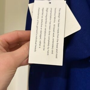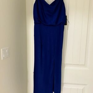 Stunning cobalt blue midi dress. Features a cowl neck, thin straps, and a thigh-high slit. Size 6. New with tags.